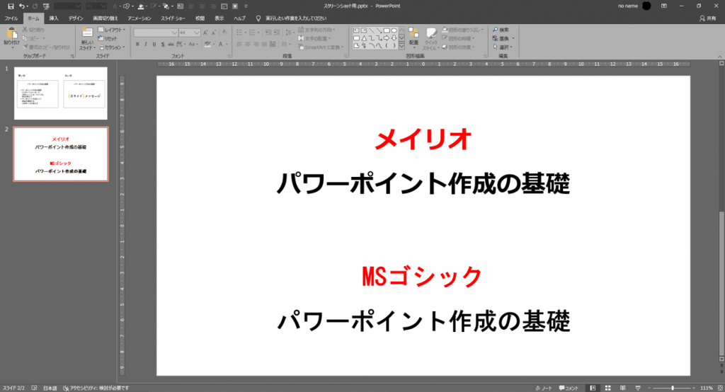 プレゼン資料でおすすめしたいのは、「メイリオ」または「游ゴシック」です。